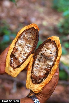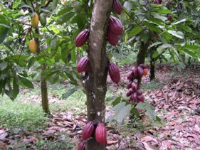 Ca cao, Theobroma cacao, là một loại cây thường xanh trong họ Malvaceae, được trồng để lấy hạt (đậu) được sử dụng chủ yếu trong sản xuất sô cô la. Cây ca cao là một cây phân nhánh với những chiếc lá đơn giản, nhọn (hình mũi mác) có thể dài tới 61 cm (24 in) và rộng 10 cm (4 in). Cây tạo ra các cụm hoa màu vàng nhạt, mỗi bông có năm cánh và lá đài