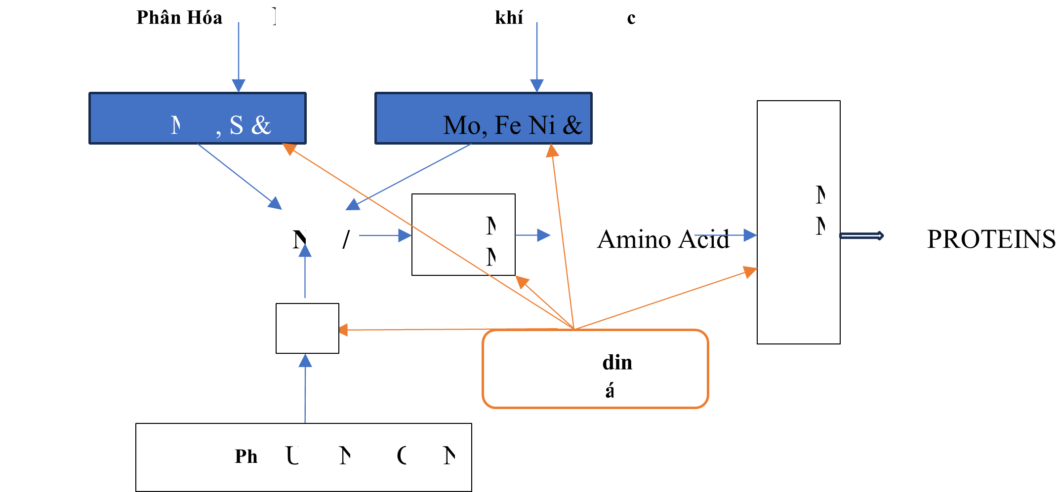 - Đối với đạm từ khí quyển, để chuyển đổi qua Ammonium cần phải có các chất dinh dưỡng Molly, Sulfur, Fe và P là những chất xúc tác cần thiết cần phải có. Nếu thiếu những chất này thì quá trình tạo protein sẽ không thành.